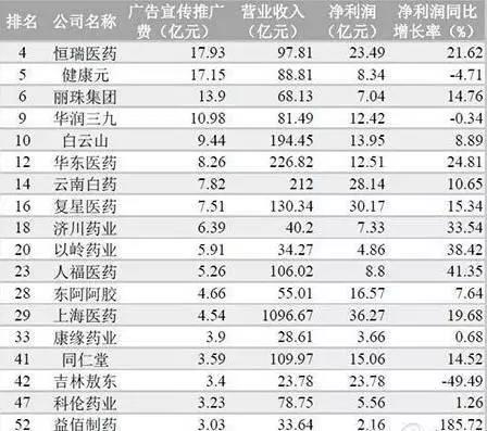 东方财富网此前一组公开数据显示,在 “2016年上半年上市公司广告投入榜”上,在广告投入排名前55位的上市公司中,恒瑞医药、健康元、丽珠集团、华润三九、白云山等19家医药企业位列其中。